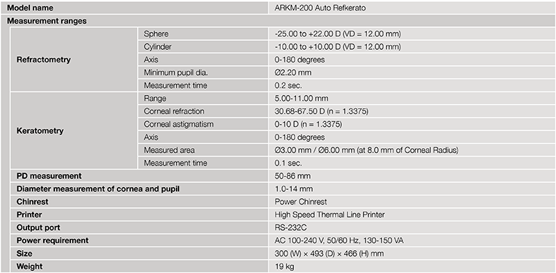 A highly accurate machine which facilitates short examination times combined with ease of use making the ARKM-200 an essential for the professional. The advanced touch-screen display allows you to perform both Refraction and keratometry with one simple movement. Capture one eye on the display and the ARKM-200 will display both eyes automatically. The ARKM-200 allows efficient examination of patients with the new features.