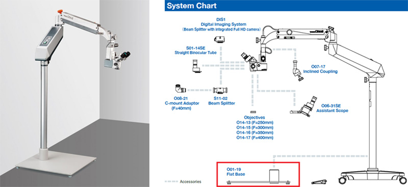If the standard base of OM-6 Operating Microscope is switched for a flat base, it is possible to install the microscope flush to the wall, and the base can be placed under a bed, enabling safe and comfortable procedures and operations even in confined spaces.