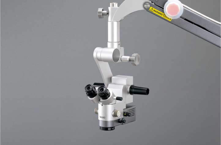 A microscope head tilt mechanism suitable for glaucoma surgery is included, offering a wide range of motion of ±30°. The handle-based design allows quick and intuitive operation, enabling adjustment to the desired viewing angle.
