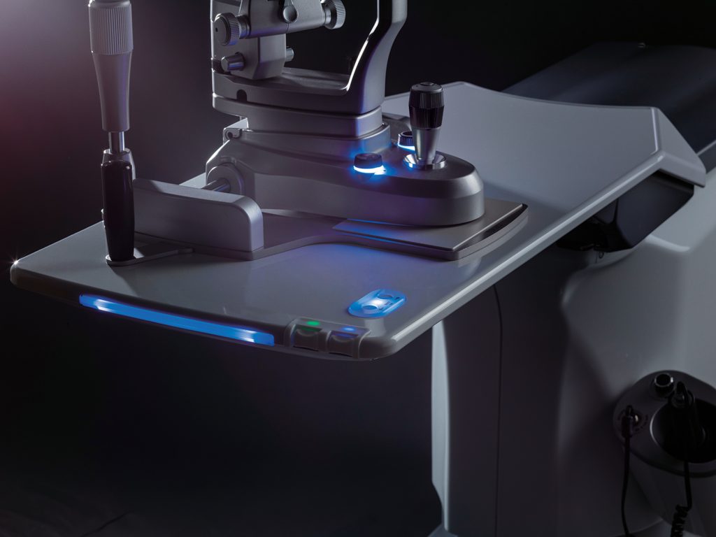 The slit lamp on the table easily moves up and down for best positioning and retracts neatly when not in use, providing complete safety and optimal inspection time.
