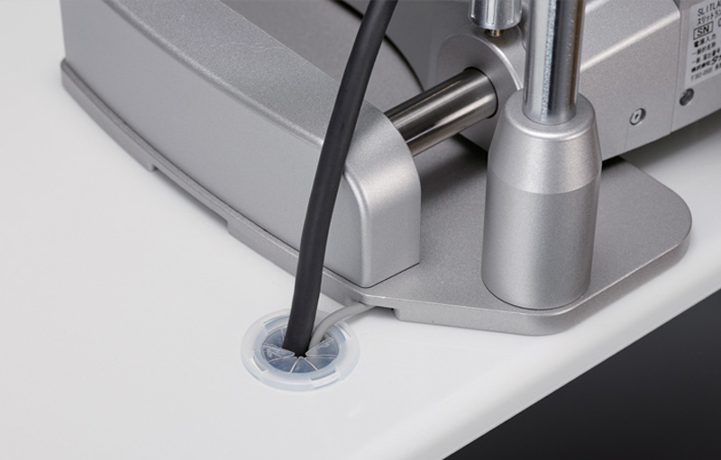 The slit lamp power cable, camera cable can be stored inside the table through the cable access hole in the tabletop, minimising their exposure to the outside.