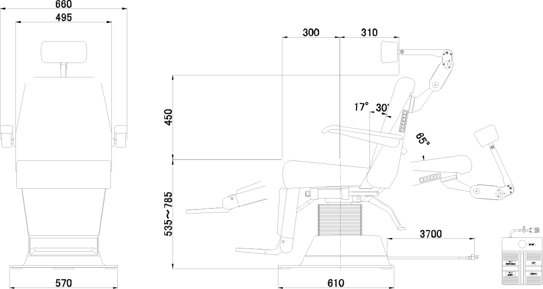A standard foot switch controls lifting/lowering, back/forward tilting, and stopping positions of the chair.