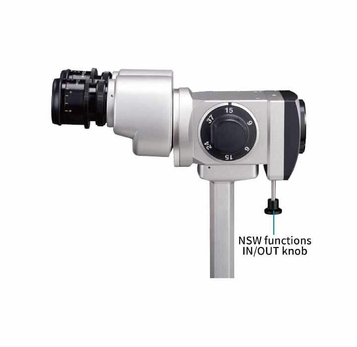The slit illumination control knob and background illumination control knob, positioned around the joystick, are thoughtfully designed for comfort in size and tactile feel. Their intuitive one-handed operation allows adjustments while looking through the microscope. Additionally, the trigger button on top of the joystick enables image capture without releasing the joystick.