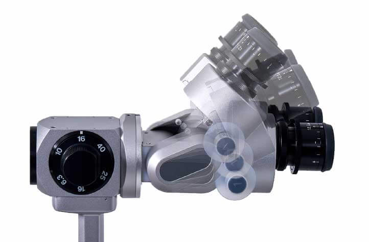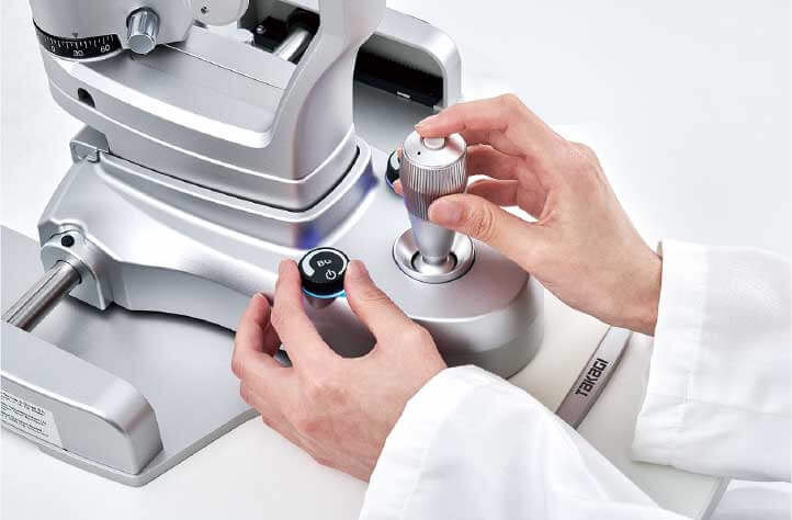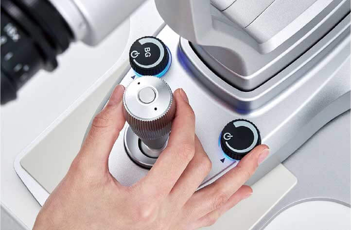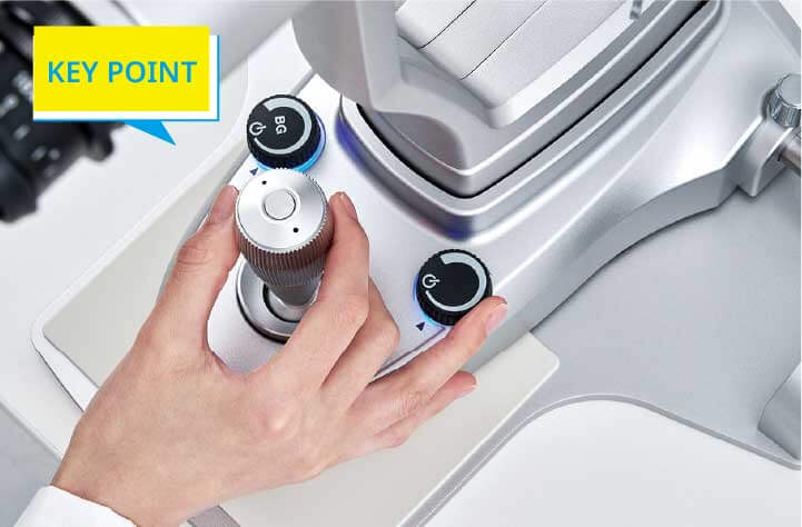 The slit illumination dimming knob and background illumination dimming knob, positioned around the joystick, are thoughtfully designed for comfort in size and tactile feel. Their intuitive one-handed operation allows adjustments while looking through the microscope. Additionally, the trigger button on top of the joystick enables image capture without releasing the joystick.