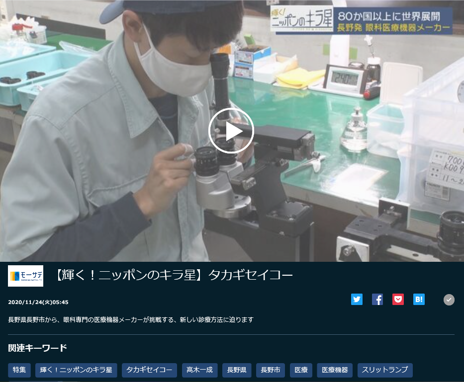 今回の放送は代表取締役 髙木一成のインタビューをはじめスリットランプの光軸調整の大切さ、眼科医療が届かない場所でも誰でも手軽にスマートフォンのカメラを使用し、画像を取得できるモバイルスリットランプMS1について紹介されました。