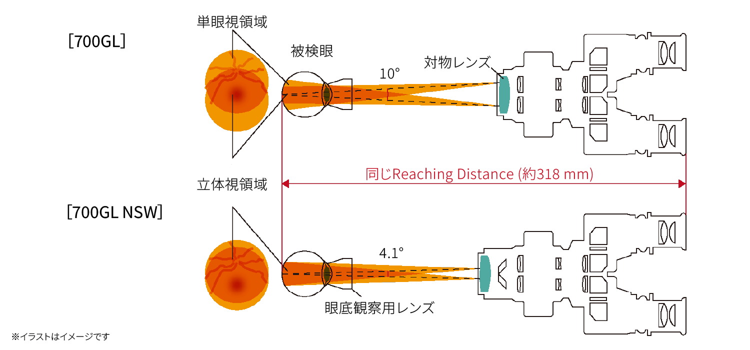 700GLの視路角10°に対し、NSWはこれを4.1°に変更することで、より広い立体視領域を確保。眼底を詳細に観察しやすくなり、精度の高い診断を行うことができます。