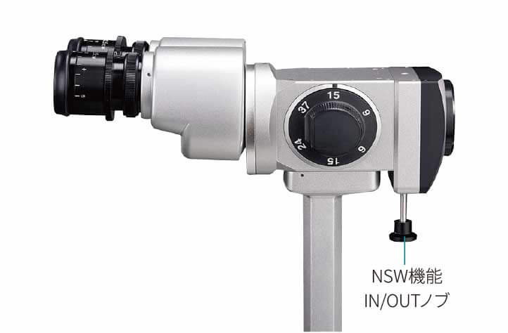 700GLの視路角は10°に設定されており比較的眼底が診やすいスリットランプですが、NSW機能をONにした700GL NSWでは視路角が4.1°となり、700GLよりも約133%広い立体視領域が得られ、より詳細な眼底観察が可能になります。眼底観察等を頻繁に行う特殊外来や眼底カメラを常設していない場合の眼底検査用装置としてご活用いただけるスリットランプです。